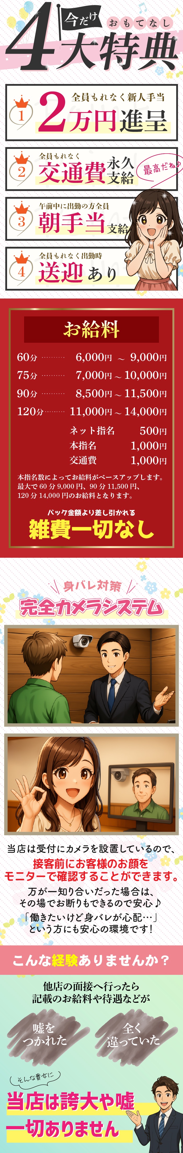 女の子のお仕事に対してノルマや罰金などがないお店だよ♪お店によっては、入店から◯ヶ月以降からはノルマが発生したり、無断欠勤などでは罰金になってしまうなどルールがあったりもするから、入店前にはしっかり聞いてみてね!