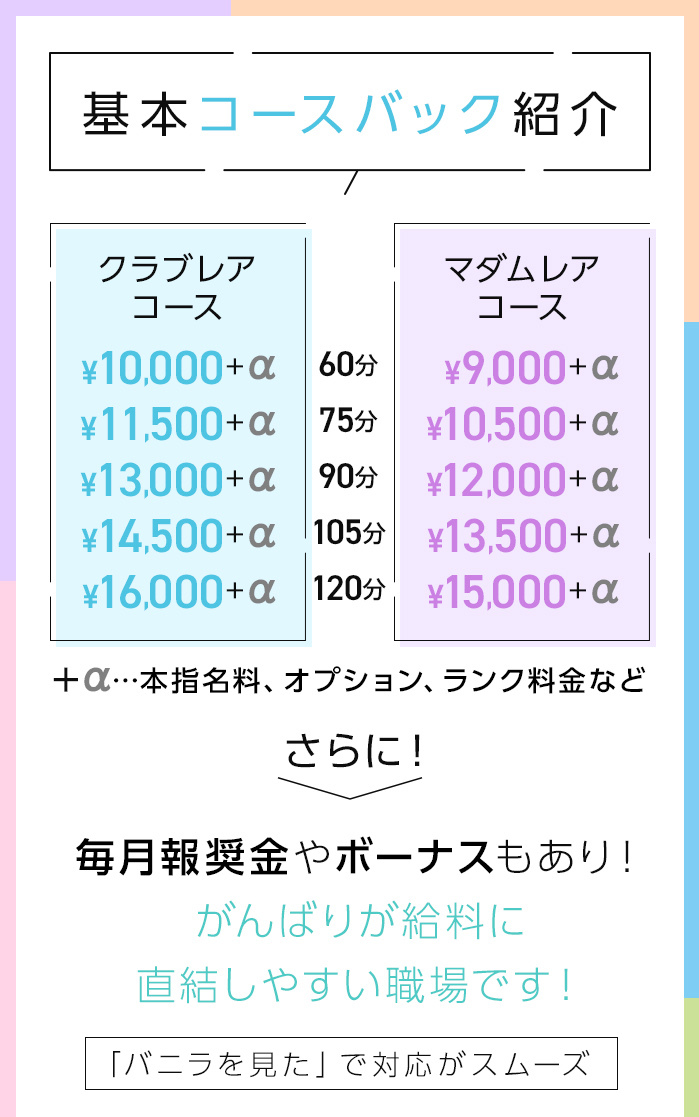 お客様が全然付かなかった場合でも一定の金額分をお店がお給料として保証してくれるシステムだよ♪「全然稼げない!」という心配がないから嬉しい待遇だね!お店によってルールに違いはあるみたいだから詳しく聞いて確認してみてね☆