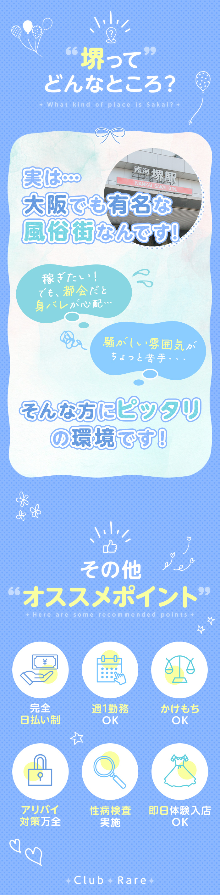 クラブレア堺店求人担当です(^^)/~~~~貴女はいくら稼ぎたいですか?~5万円!10万円稼げます!って広告を見て興味を持たれるかと思いますが、実際それってほんと?と思いませんか?そこで!!!私がわかりやすくご説明致しますね!当店は堺エリアで17年以上の実績があり顧客様が非常に多いお店と自負しております。また集客媒体もアクセス数も第一位継続しております!また、近年少なくなってきましたが、ホテルヘルス(店舗受付型)+デリベリーヘルスの両方の受付ができますので、集客がデリヘルのみの店舗様に比べて2倍ということになります。またホテルヘルス(店舗受付型)の場合、使用するホテルもビルの隣のホテルを使用しておりますので移動時間もかかりませんので効率よく稼いでいただけるかと思います♪貴女が稼ぎたい金額や、出勤スタイル等貴女のご希望をぶつけてください(^^♪効率よく稼いで頂くために貴女に合った稼ぎ方のプランをスタッフも一緒に協力させていただきます♪一緒に頑張って目標を達成しましょう♪お問い合わせのみでも結構です。お気軽にご連絡お待ちしております☆ 面接・体験入店は平日・休日問わず、いつでも受付しています。メールや電話でお気軽にご連絡下さい。当日のご連絡も大歓迎です☆