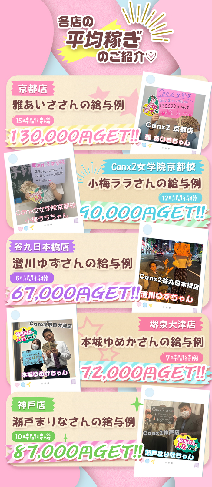 【Canx2グループ全店】採用強化中|未経験歓迎・日払いOK・顔出しNG可こんにちは!Canx2代表の村田です🙇🏻♂️たまにブログ担当してます😌よろしくお願い致します🙇🏻♂️当店では「特別な待遇」をご用意してます🙆🏻♂️✅永久にほぼフルバック対応▫️特別なインフルエンサー枠のキャストさん▫️姫予約で埋めれるキャストさん特別優遇させていただきます🙇🏻♂️🙇🏻♂️当店は新規店舗でこれから大きく拡大する必要があります。キャストさんのお力を借りないとまだまだ影響力が足りません🥲認知度の高いキャストさんやすでに姫予約が埋まりやすいを特別な待遇で採用させていただきます🙇🏻♂️ほぼフルバックの目安としてお店の店落ちは1件につき3000~5000円のみ例えば60分25000円の支払いの方はお給料60分22000円店3000円雑費等の引かれものはなしでご対応します👍🏻もちろんこちらは一例になりますので入店していただく方のご状況など考慮してご相談させて頂きます😊お店としては最低限の運営費確保のみそれ以外は広告費として女性に全て還元します🙏🏻もしお問い合わせ段階に詳しいお話をご希望の場合は「代表の村田に繋いでください。」とお伝えください🙇🏻♂️京都で最大手のグループが大阪進出😊今年の3月に神戸も進出しすでに黒字化!すごく勢いに乗ってるグループなんです🙆🏻♂️ぜひ当店で輝いてみませんか??最高のプロデュースとサポートを致します🙇🏻♂️募集概要(要点)・応募資格:18歳以上(高校生不可)/未経験歓迎/経験者優遇/掛け持ちOK/学生・主婦・Wワーク歓迎/清潔感のある方・勤務時間:自由シフト(1日3時間〜OK/週1〜OK)・待遇:日払い・個室待機・顔出しNG可・指名バックあり・ノルマ罰金なし・勤務地:京都・神戸・大阪エリアお好きなエリアでお仕事出来ますご応募〜お仕事までの流れ LINE/電話で応募(ご希望日時をお知らせください) 面談・店内見学(所要約60分) 無料講習(希望者のみ/女性講師) お仕事スタート(当日体験もOK)営業時間:10:00〜翌3:00/年中無休。条件・待遇は面談時にご説明します。身分証のご提示が必要な場合があります。※面接の交通費は規定内支給。詳細はお問い合わせください。アクセス全店最寄り駅からすぐ!/近隣コインパーキングあり