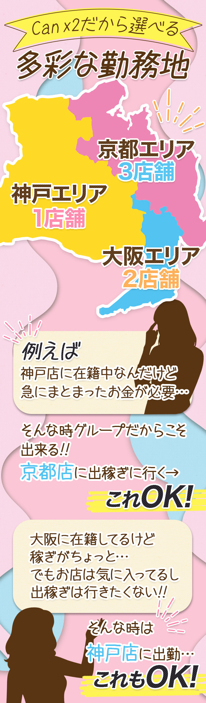 【Canx2グループ全店】採用強化中|未経験歓迎・日払いOK・顔出しNG可題名の件ですが「ズバリ稼げます!」それは何でか??検証していきたいと思います!1️⃣客数が絶対的に多い!やっぱりココ!良いお店にはお客さんがいっぱい集まります!更には当店はホテヘルだけではなくデリヘルもやっていますので受付の幅が広い!!昼間はホテヘルメインで動き深夜帯はデリとホテが5:5程度で動きます。どの層のお客様でも対応できるのが大きいです!2️⃣回転が早い!!当店のメインは時間帯にもよりますが「ホテヘル」が6~7割を占めます!なので移動時間のロスが少ないです!デリでも南インターが中心なので総じてロスは少なめになります!3️⃣単価が良い!!コースにもよりますが良いと思います!一番多いコース分数は80分になりますのでガールコース:12000円~15000円レディコース:11000円~14000円上記の金額が1名の接客で入ります!例えばガールで2000円指名の方なら80分が3本で4万円を超えてきます!この上記3点の合せ技によって女の子が稼げるお店になっています!募集概要(要点)・応募資格:18歳以上(高校生不可)/未経験歓迎/経験者優遇/掛け持ちOK/学生・主婦・Wワーク歓迎/清潔感のある方・勤務時間:自由シフト(1日3時間〜OK/週1〜OK)・待遇:日払い・個室待機・顔出しNG可・指名バックあり・ノルマ罰金なし・勤務地:京都・神戸・大阪エリアお好きなエリアでお仕事出来ますご応募〜お仕事までの流れ LINE/電話で応募(ご希望日時をお知らせください) 面談・店内見学(所要約60分) 無料講習(希望者のみ/女性講師) お仕事スタート(当日体験もOK)営業時間:10:00〜翌3:00/年中無休。条件・待遇は面談時にご説明します。身分証のご提示が必要な場合があります。※面接の交通費は規定内支給。詳細はお問い合わせください。アクセス全店最寄り駅からすぐ!/近隣コインパーキングあり