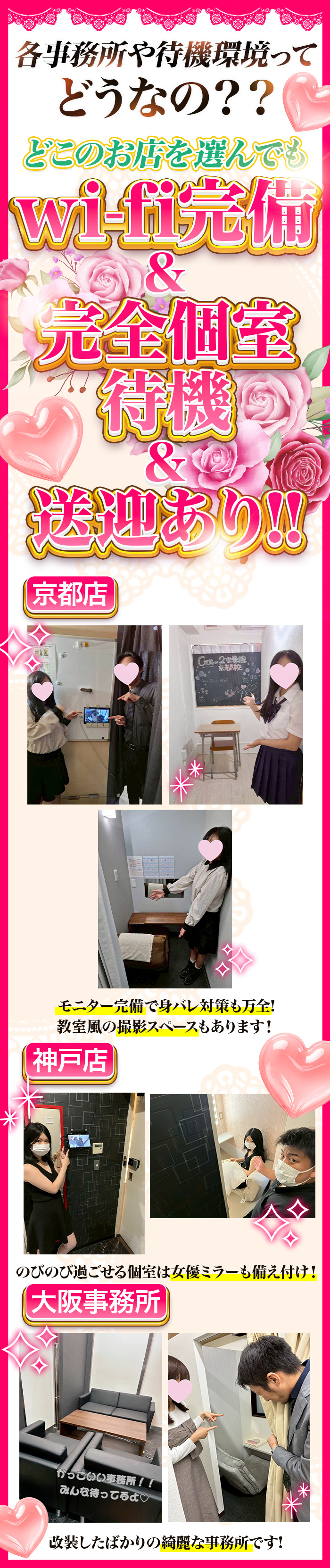 ✅京都店と神戸店はホテルヘルスで運営してますので店頭でカメラでお客様の顔確認が出来ます。大阪に店舗ではお車の中で顔確認して頂くなど対策を取らさせて頂いております。