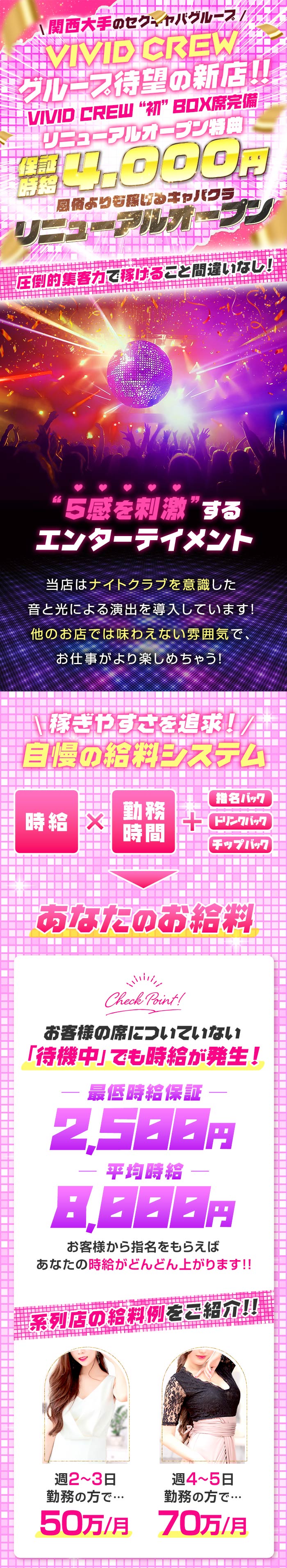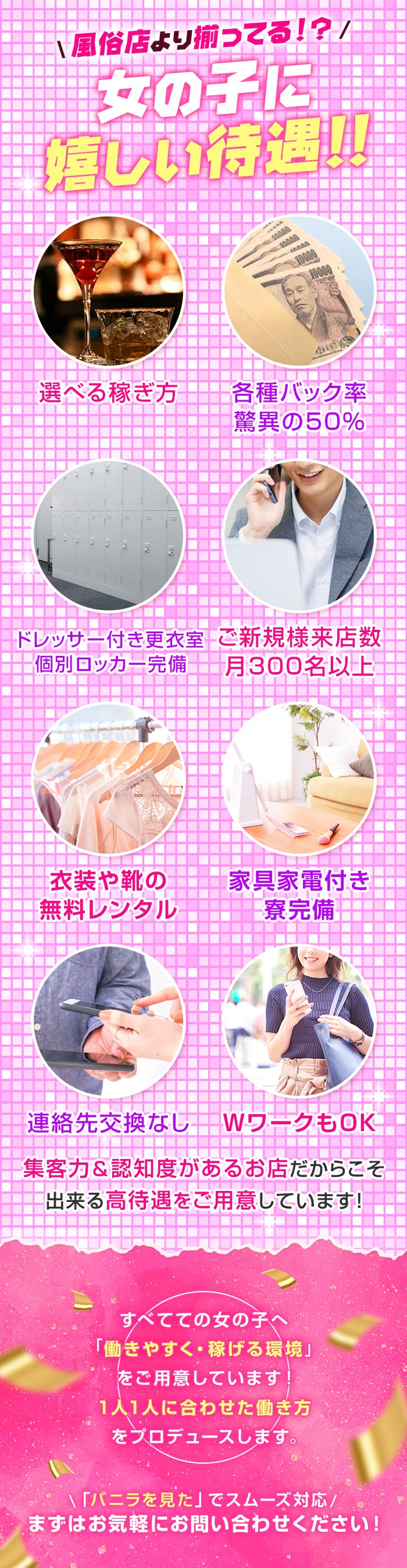業界の常識を覆す圧倒的取り組みシリーズパート5平均時給8,000円以上の訳ピンクパーティパラダイス、リニューアルオープンに伴い、システムや仕組みを一新しております。保証時給指名バックドリンクバックチップバックインセンティブは全て50%還元。時給換算10,000円、無理なく目指せます。まずはお問い合わせください。