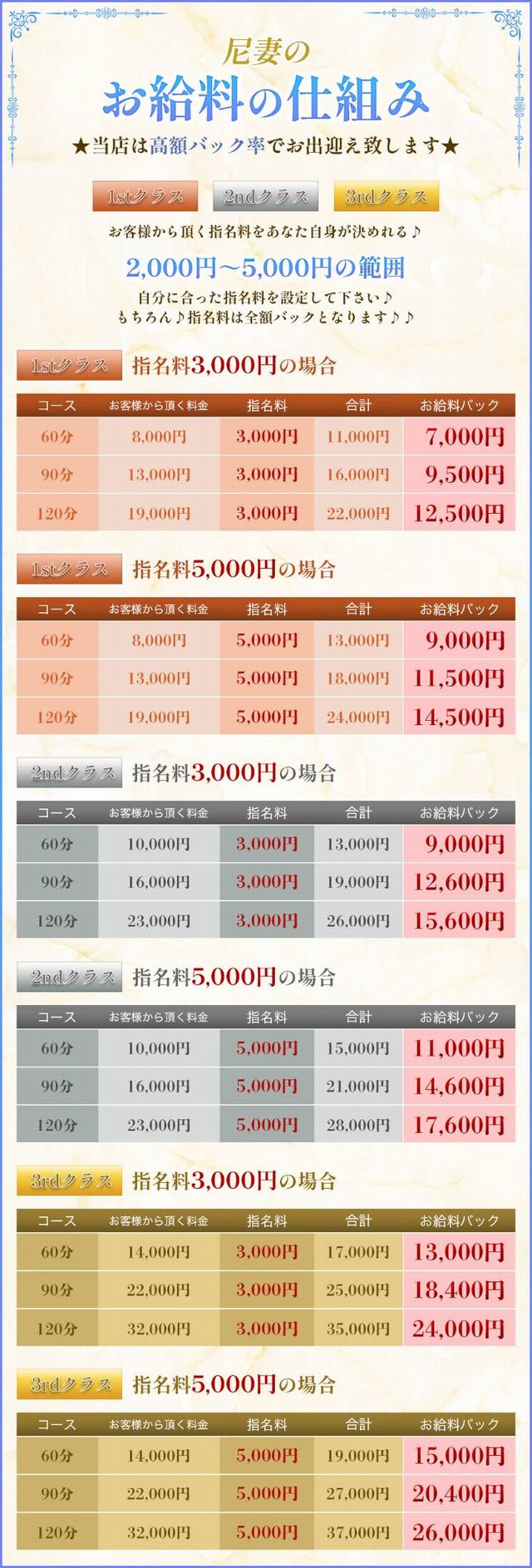 ≪尼妻のお給料≫ 【1st クラス】 【最高手取り:60分9,000円】 【2nd クラス】 【最高手取り:60分11,000円】 【3rd クラス】 【最高手取り:60分15,000円】