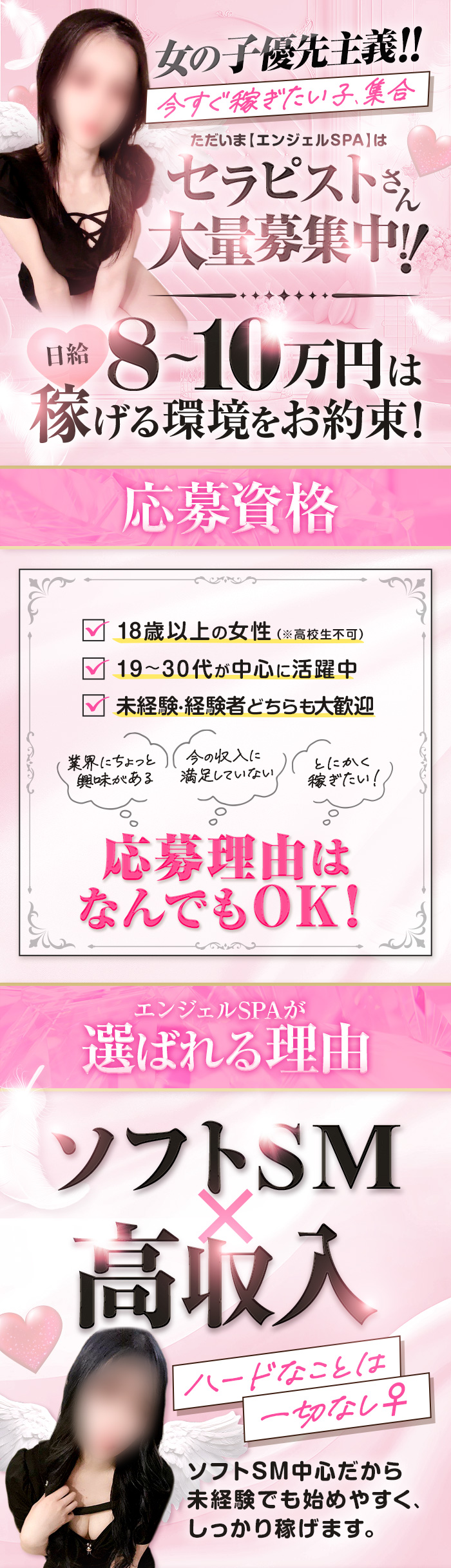 ・若い子ばかりで働きづらそう…💦・20代しか需要がなさそうで稼げるか分からない…😔大丈夫です。エンジェルSPAはそんな区別一切致しません‼️当店は男性スタッフも20代はおらず、女性同士の接触は最小限に致しております✨若い子だけが稼げる!と言う概念は一切ございません☺️→年上の女性に甘えたい🤤→安心できるし包容力がある👀フリー氏名でのお客さまでもドシドシとご案内させていただいています🙈💓スタッフ一同大歓迎ですのでお問い合わせご気軽にお待ちしています✉️
