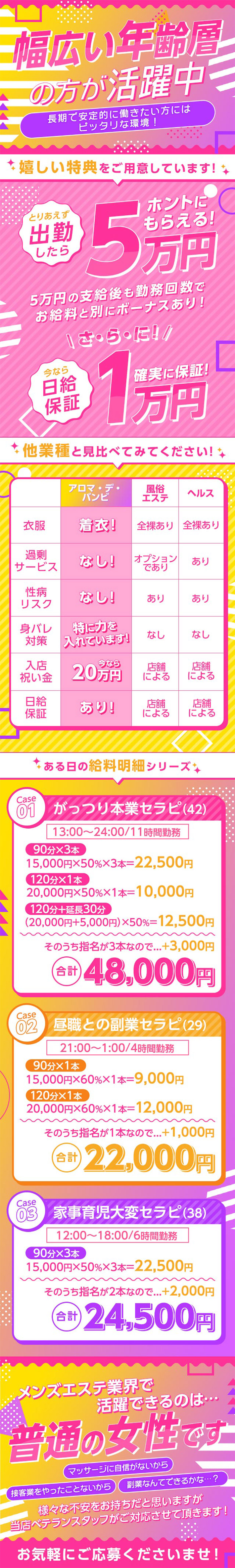 !!新人期間は確実に稼げますよ!!自身のお客様がいない移籍したお店で新たに指名のお客様をつかめるかな未経験で技術もないのにお客さがつくのかな未経験でお客様をつかめるか心配いりません!!顧客、常連のお客様がたくさいらっしゃるので新人のセラピストさんが入ればとりあえずどんなセラピストさんかなとご指名いただけるので入店すぐは確実に稼げます!!入店後1カ月は日給保証もあるので安心。!!新人期間は確実に稼げます!!
