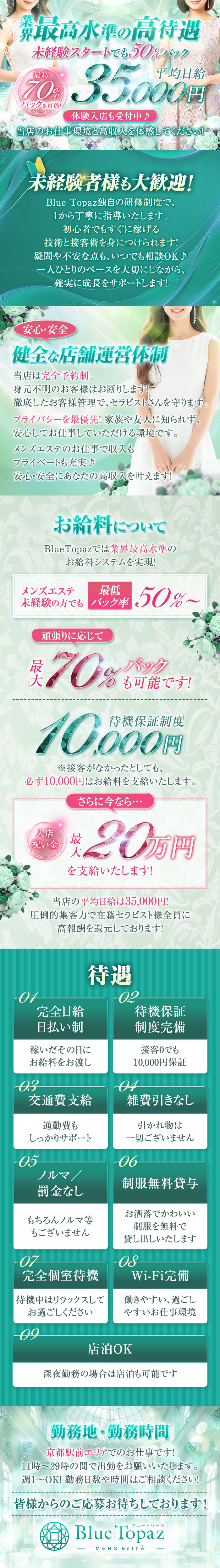 業界最高水準でお出迎え♪必ずお給料1万円は支給致します!!当店は未経験者様大歓迎♪~無料研修制度と手厚いフォローで安心~BlueTopaz(ブルートパーズ)では女性講師による研修制度やフォロー体制が充実していますので未経験の方も安心してスタートいただけます!メンズエステ未経験の方はより丁寧に指導させていただきますので、自分のペースで確実にプロの技を身につけることが可能です!また、お客様への接客マナー等も身に付ける事が可能なので、技術とマナーの両方のスキルアップに繋がります!!女性講師による研修制度やフォロー体制が充実していますので未経験の方も安心してスタートいただけます!完全予約制で非通知や公衆電話など身元がはっきりしないお客様からのご予約はお断りしております!!また、お客様管理をしっかりとおこなっているので安心して働き易い環境です!!不安な方はお問合せだけでもOK!皆様からのご応募・お問合せ心よりお待ちしております!