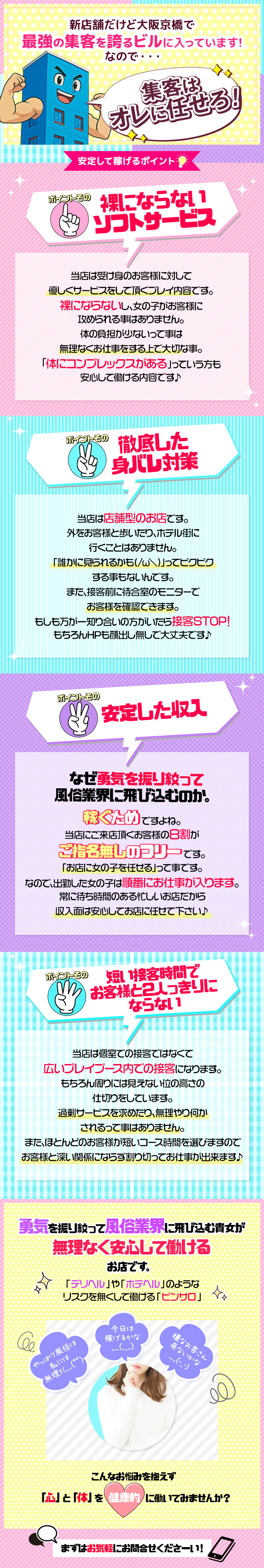 面接の時に、その「下半身のお触り」の事で苦しんでいる女の子をたくさん見てきました。 当店の基本コース(8割位のお客様が利用する)は、お客様からキャストへの下半身のお触り完全NGです。全裸になる事もございません。 そのような環境で安定して稼げるお店は、当店だけだと自負しています!