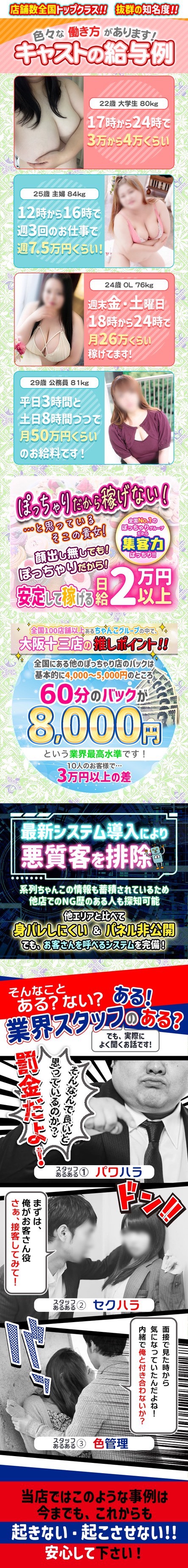 \当店は「女の子ファースト」本気でやってます💪✨/「ちゃんと話を聞いてくれるお店、ありますか❓」面接に来てくれた女の子から、よく聞かれる言葉です👂過去に「流されちゃった…」「質問しても曖昧な返事ばかりだった…」なんて経験があると、次のお店選びも慎重になりますよね😔でも、ちゃんこ十三店は違います🙅♀️❗女の子一人ひとりと、真剣に向き合っています❤️当店では、働き方を“お店が決める”ことはありません✋あなたの希望をまず聞かせてください😊・週1からでもOK🙆♀️・短時間勤務でも大歓迎🌈・人見知りでも、ぽっちゃりでも、未経験でも問題なし✨**「この子が一番輝ける働き方💖」**を一緒に考えるのが、ちゃんこスタイルです✨そして…「相談しやすい😌」「話をちゃんと聞いてくれる👂」そんな声をたくさんいただいています🌸実際に「ここで働きたい🥰」って言ってくれる女の子、増えてるんです📈!ぽっちゃりさん専門店として、💴 60分バック8,000円以上❗🈵 オプション・指名料はフルバック✨🙅♀️ 痛客ゼロのリピ様メイン💖🏨 店泊無料もOK❗だから、ストレスなくしっかり稼げる💰💕そして、スタッフは女の子の味方です👫面接のときから“あなたの気持ち”を大切にしています😊✨「ぽっちゃりでも大丈夫かな…🤔」なんて悩まないでください❗あなたの魅力、ちゃんと活かせる環境がありますよ🌟ちゃんこ十三店は、【あなたらしく🌷】働けて、【ちゃんと稼げて💸】、【信頼されて応援される💞】お店です✨気になった方は、お気軽にLINE(@chanko.juso)またはX(旧Twitter)(@chanko_osaka)からご連絡くださいね📩💕