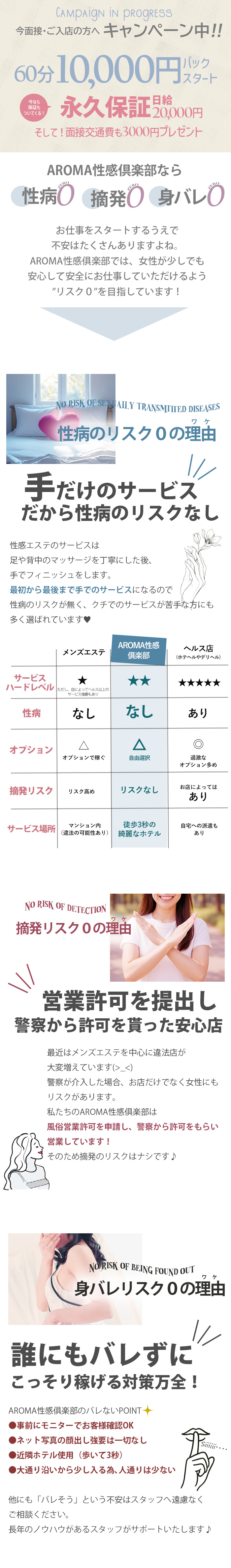 AROMA性感倶楽部の基本サービスは①オイルマッサージ②ハンドサービスの2つだけ!“手”だけのサービスになりますので安心してお仕事していただけます。また、性感サービスはなんとたったの “15分”✦初めての方にもおススメです♪オイルマッサージも初めての方でも安心してお仕事いただけるように女性スタッフが講習をさせていただきます♪2時間ほどで覚えられる内容で分からない事はすぐに聞けます♪初めてで不安なこともありますが貴女のペースでお仕事ができるようしっかりサポート致します♪▼お問い合わせ▼TEL:080-4481-7796MAIL:esth.tennouji@gmail.comLINE ID:esth-t