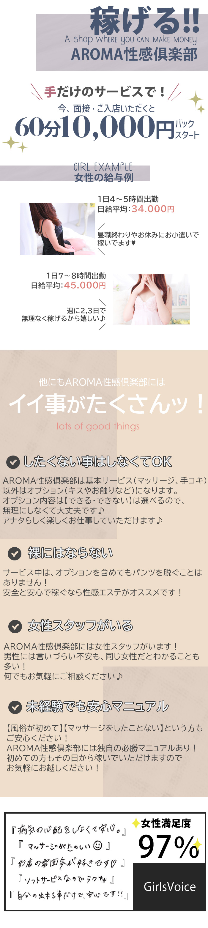 ご質問、ありがとうございます(^^) ソフトサービスのお店でも、お店によっては稼いでいただけます♪ AROMA性感倶楽部では、ご自身の頑張りですぐにバックも上がる、 ステップアップシステムとなっておりますので、 手だけのソフトサービスでも、しっかり稼いでいただけます(^^) まずは一度、体験入店からお気軽にお越しください♪