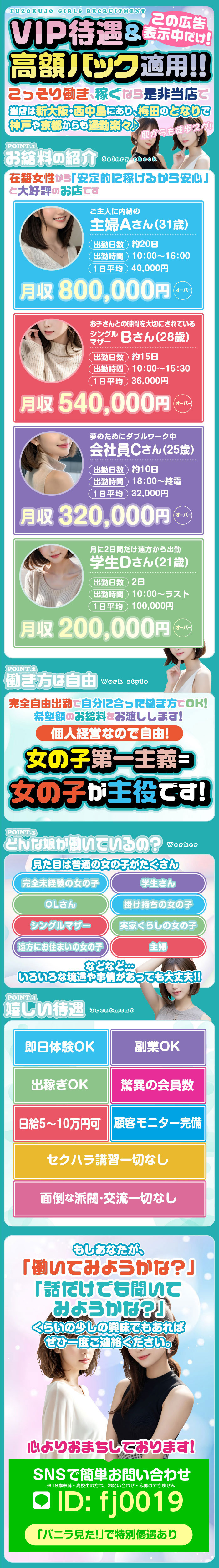 日給保証もちろんお支払いします。 当店は出稼ぎの女の子もたくさんいます。 新大阪駅から徒歩圏内です。 よければ大阪旅行がてらにどうですか!? お待ちしております。 質問等もお気軽に。