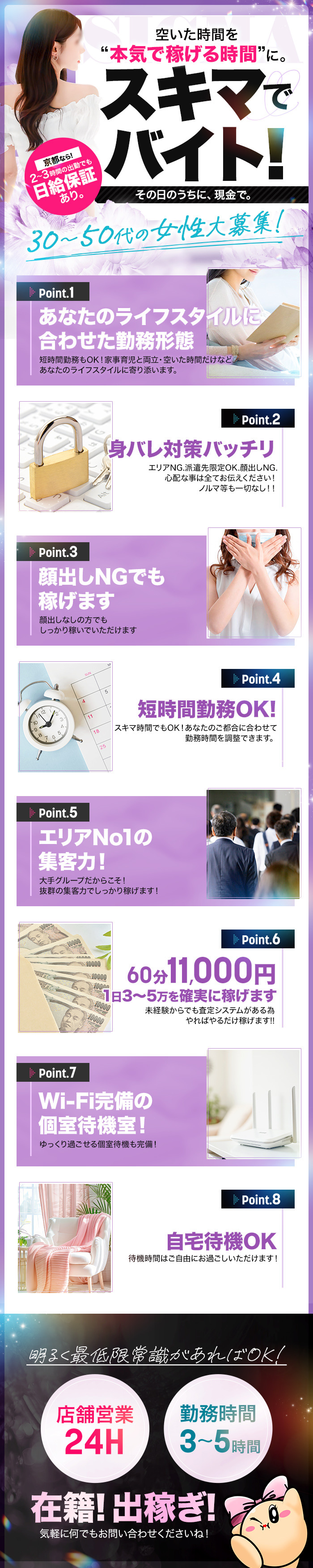 早朝からお仕事できるお店だよ。夜勤明けのお客様は朝方にお店に来る人も多いから、たくさん稼げるチャンスあり!お店によっては「送り迎え」をしてくれるところもあるみたいだから、詳しくはお店に聞いてみよう♪