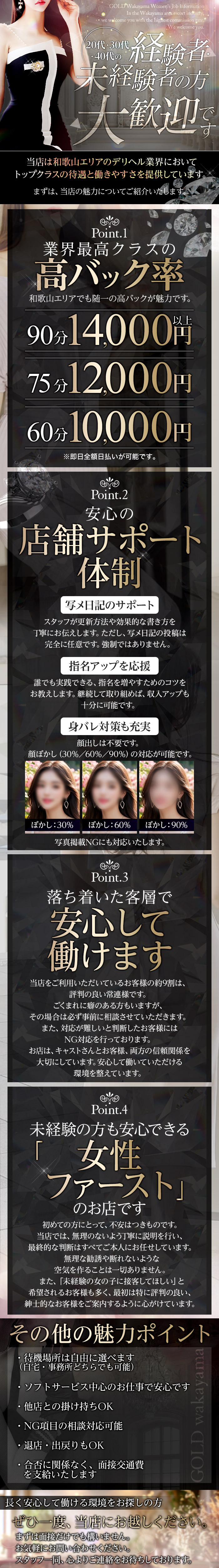 こんにちは!GOLD和歌山の店長の佐々木です😊今日は当店の“働き方”についてご紹介します💆♀️GOLD和歌山では、女の子一人ひとりの生活スタイルに合わせて、自由に働ける環境を整えています✨「週1だけ出たい」「短時間でしっかり稼ぎたい」「昼職と掛け持ちしたい」そんな希望も全部OK🙆♀️出勤は完全自由制!お給料は完全日払い💴送迎もあるので通勤も安心です🚗未経験から始める方も多く、「最初は緊張したけど思ってたより楽しかった!」なんて声もたくさん届いてます☺️自分のペースで、しっかり稼ぎながら無理なく働ける💛そんな環境を探してる方は、ぜひ一度お話してみませんか?✨