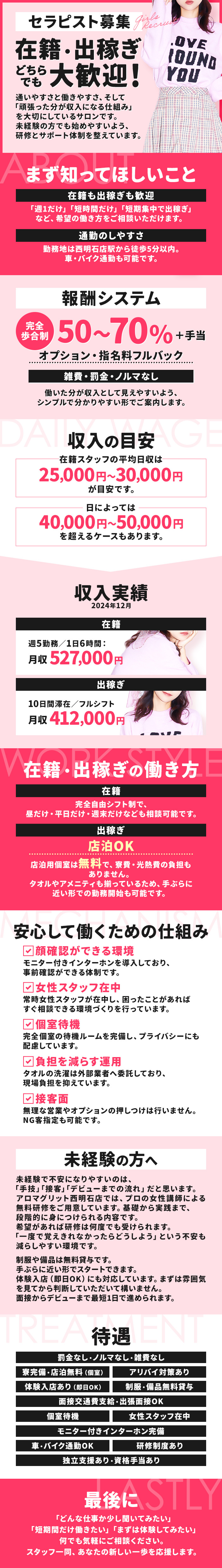 当店の求人ページをご覧いただきありがとうございます!!アロマグリット西明石店で新しい働き方を見つけてください♪《待機保証あり◎出稼ぎ・在籍どちらもOK》 当店では、一緒に働いてくれるセラピストさんを募集しています♪「メンズエステってどんなお仕事?」「どのお店を選べばいいかわからない…」そんな方にも安心していただけるよう、当店の魅力をたっぷりお伝えします!各箇所嘘偽りなく記入しております。少しでも「いいな」って思えましたら、お気軽にご応募ください♪