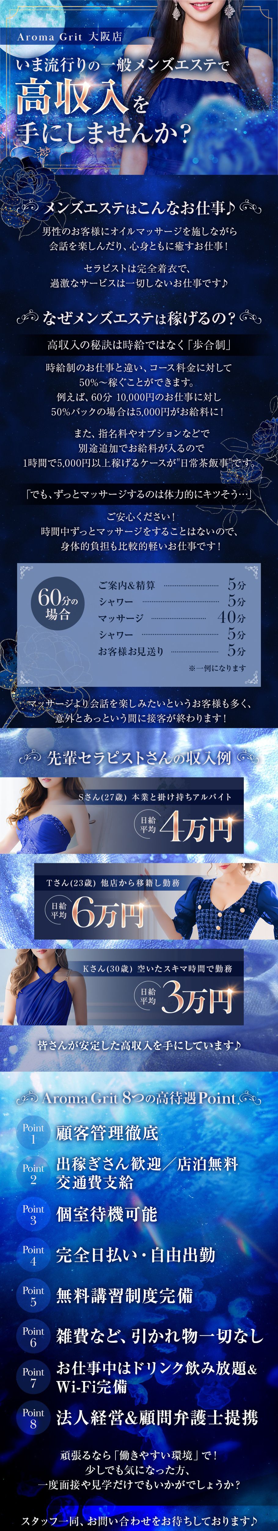 当店の求人ページをご覧いただきありがとうございます!!アロマグリット天満店で新しい働き方を見つけてください♪《待機保証あり◎出稼ぎ・在籍どちらもOK》 当店では、一緒に働いてくれるセラピストさんを募集しています♪「メンズエステってどんなお仕事?」「どのお店を選べばいいかわからない…」そんな方にも安心していただけるよう、当店の魅力をたっぷりお伝えします!各箇所嘘偽りなく記入しております。少しでも「いいな」って思えましたら、お気軽にご応募ください♪