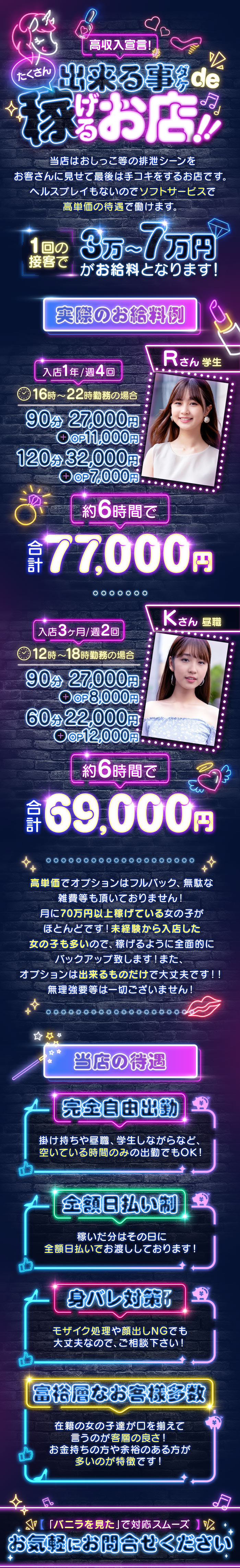 ★60分¥20,000円~22,000円+OP全バック ★90分¥25,000円~27,000円+OP全バック ★120分¥30,000円~32,000円+OP全バック 更に面接交通費・準備金10,000円!レギュラー出勤で住宅手当・指名ボーナスなど、本当に嘘偽り無くどんどんギャラを差し上げますので70万以上稼いでる子が沢山いるんです! 税金が高くて大変だからこそ出来るだけ多く女の子に沢山お給料を払いたいお店です!!! |