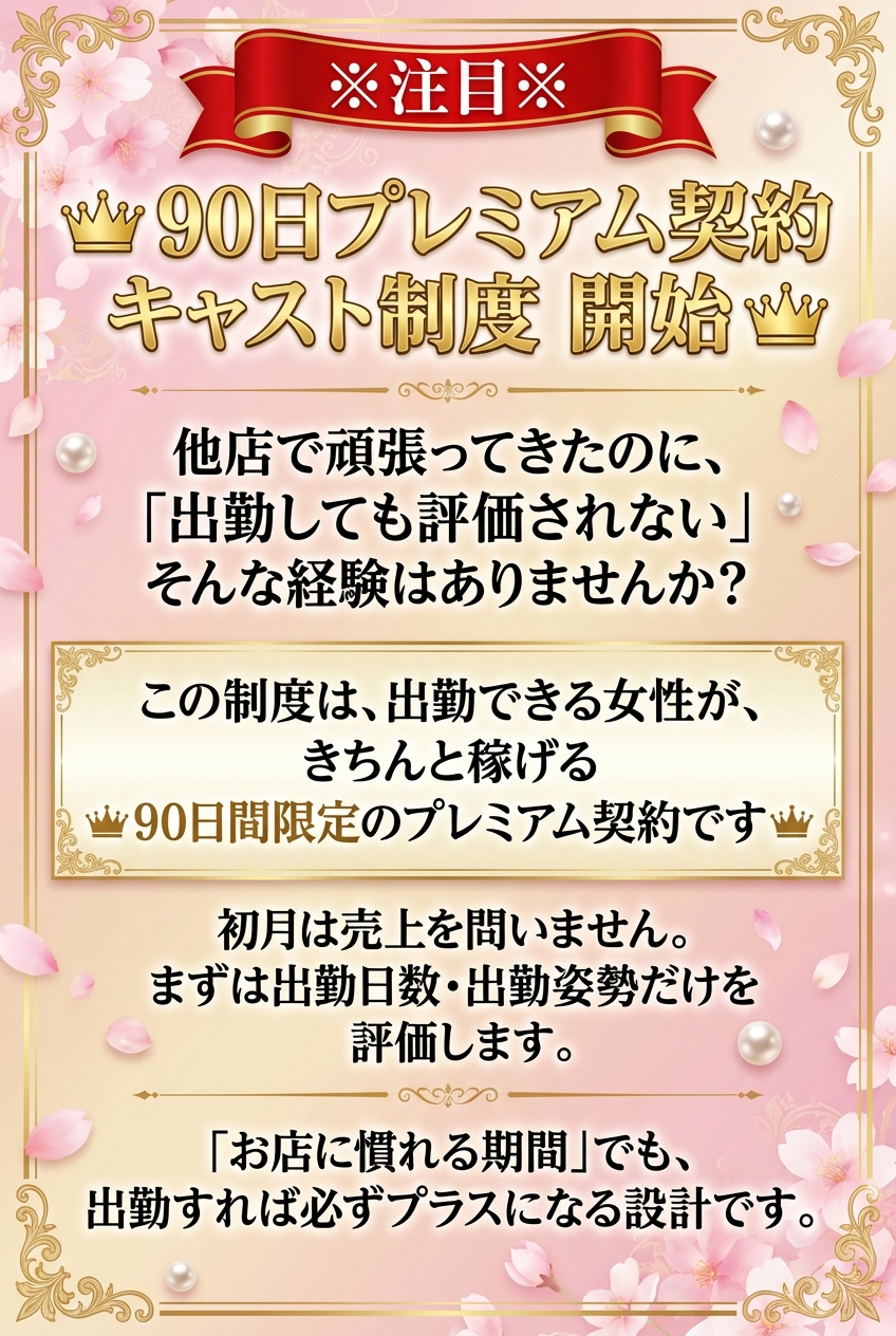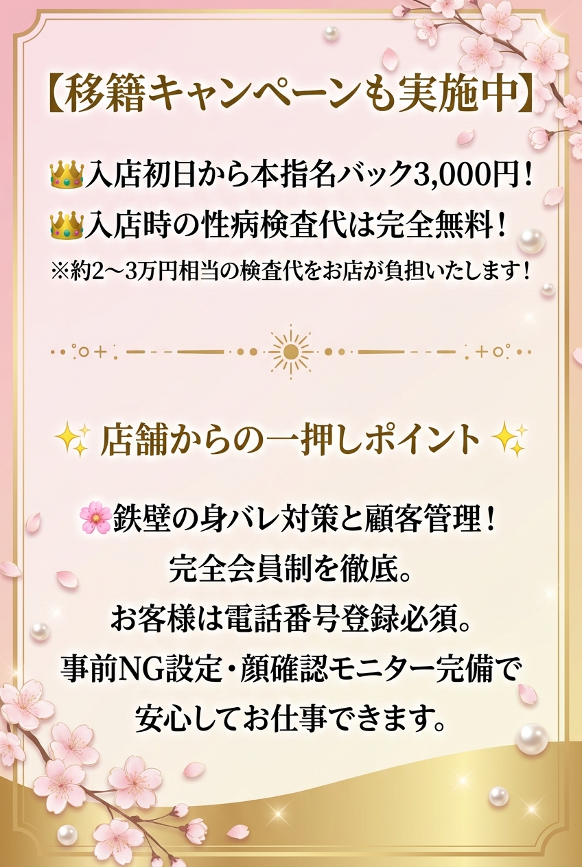 ✨ お給料公開 ✨TOPクラスの報酬額! 2/6(金) お給料TOP 14:30 ~ 23:00(実働 8.5時間)短時間でもキャリアを活かしてしっかり稼げる環境です!🚀 移籍優遇制度を完備30代・40代の方が、これまでの経験を即・報酬に繋げられる環境を整えました。「話を聞くだけ」の面接も大歓迎です! 💰 充実のバック体制● 本指名バック:+3,000円● ネット指名バック:1,000円 🔥 移籍キャンペーン実施中!他店様のお客様がご来店された場合、入店初日から【本指名バック3,000円】を全額お渡しいたします!「ゼロからのスタート」という不安は必要ありません。 ✨ こんな方を募集しています・30代・40代で効率よく稼ぎたい方・環境を変えて心機一転頑張りたい方・落ち着いた環境で自分らしく接客したい方 まずは気軽にお話を聞かせてください♪お問合せを心よりお待ちしております!