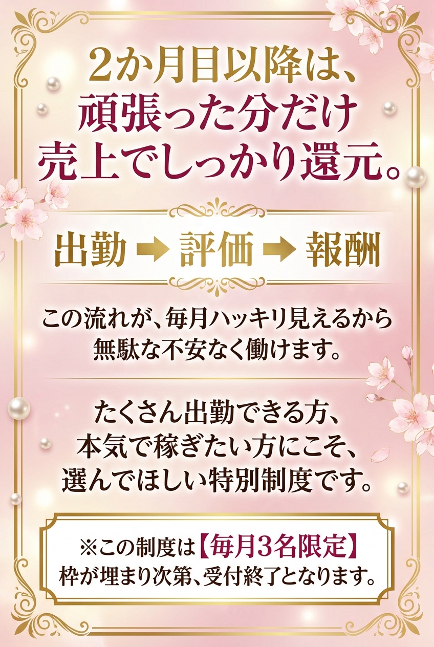 新人期間中は本当に求人に記載通りの時給を頂けます! その間にたくさんお客さんを付けてくれたり、女の子の相性の良いお客さんを選んで付けてくれたりするので、とても働きやすいです☆ 客層もとても良くて楽しく働かせてもらってます! 他の店には行けないくらいスタッフさんも優しいです☆ 体調を崩しても、すぐに対...