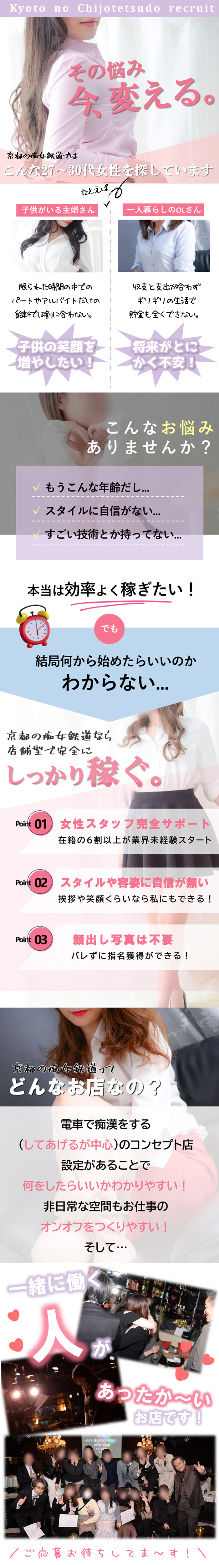 たくさんのお客様に長年のご愛顧頂き京都で16年間営業させて頂いております。 当店のモットーはお客様を大切にする事。 お客様を大切にしないお店は働くスタッフや女の子の事も大切にしません。 そんな当店が働く女の子に約束しているとても大切な事があります。 それは、1円でも多く稼いで素早くこのお仕事を卒業しよう!という事です。 このお仕事を始めるにあたっては何が何でも稼いで欲しいのです。 そして決めた目標金額を素早く稼いでとっとと卒業してください。 正直な話しをするとお給料システムなんてどのお店も大して変わりません。 お客様を獲得していけば、指名を取れれば時給がドンドン上がっていくシステムです。 当店が稼げるお店である理由はただ一つ。 たくさんのお客様にご来店頂ける!だから稼げる環境があるという事です。 オープニングキャスト募集につき5時間3万円保証と好待遇で体験入店が出来ます。 働いている女の子の70%以上は半年以内に目標金額を達成して卒業します。 それでいいのです。別に長く働く必要はありません。 たくさんの新人さんが居るので心強いと思います。 是非安心してご応募下さいませ