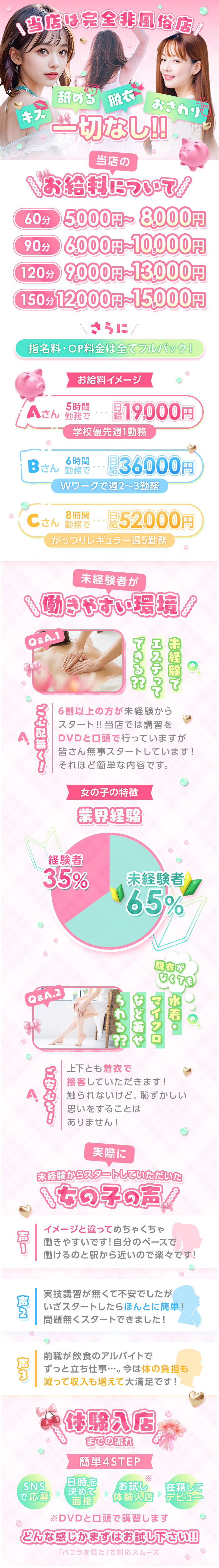 | 応募資格 | 18歳~35歳くらいまで幅広い年齢層で大募集!(高校生不可)容姿体型は問いません☆ |