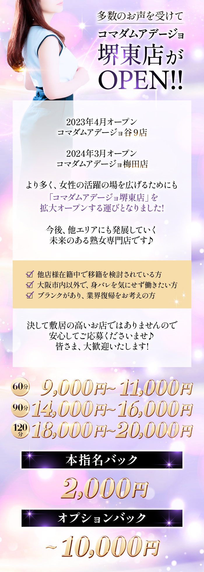 こんばんは🌛🌟地域密着「堺東」エリア完結型ホテルヘルスコマダムアデージョ堺東店店長のまこです。🌸 堺東店の報酬システムについて 🌸これから堺東店で働くことを考えている女性へ2月中に面接にお越しの方の特別報酬システムをご紹介します!👇■ 60分コース9,000円/10,000円/11,000円■ 90分コース14,000円/15,000円/16,000円■ 120分コース18,000円/19,000円/20,000円※出勤日数に応じて上記のいずれかを適用+ 本指名バック 2,000円(全員対象)堺東店は「堺東完結型」の営業スタイル。移動がほぼなく、無駄な時間や負担を減らします。その分を、しっかり女性の報酬に反映します。🌟 2月末までに面接・採用の方は上記の特別優遇をさせていただきます 🌟オープン前だからこそできる好条件・高待遇です。※3月1日以降の面接の方は対象外となりますのでご理解ください。ご検討中の方はぜひお早めにご連絡ください。面接は堺東店事務所にて実施いたします。アクセスや時間のご希望もお気軽にご相談ください。あなたのご応募、お待ちしております。