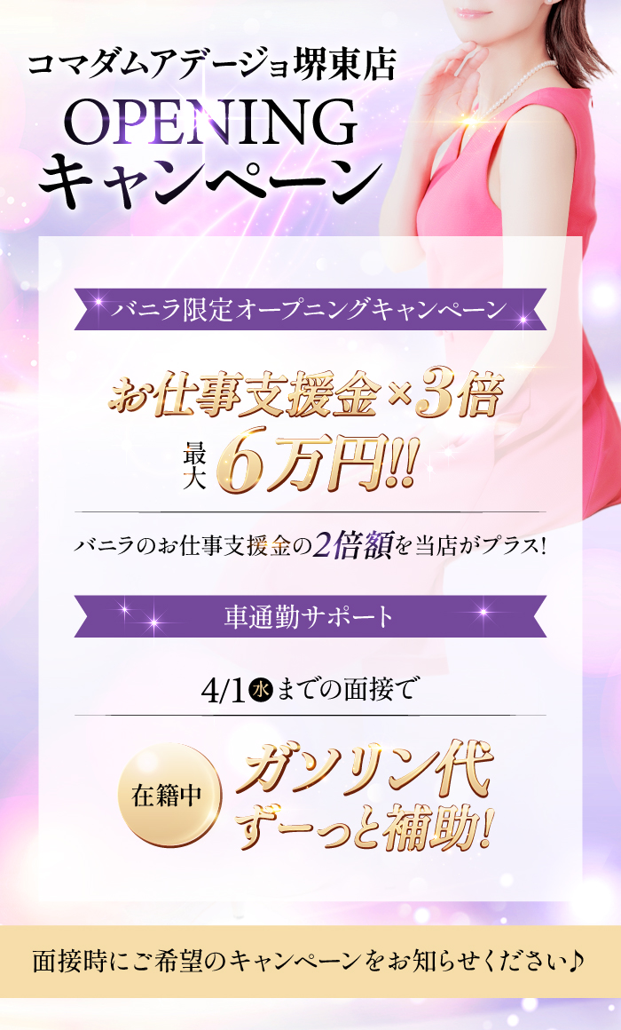 こんばんは🌙コマダムアデージョ堺東店店長のまこです(^^)v堺東店は2026年4月1日オープンです!✨ですが、面接はすでにスタートしています。「今すぐ働きたい!」そんなお気持ちの方はぜひご覧ください!👇オープンまでの期間は谷町九丁目店で勤務可能です!そして4月1日のオープンと同時に堺東店へ移籍という流れです。今から収入を確保しながら、仕事の流れや環境に慣れておけます。立ち上げメンバーのメリット🌟お店の空気を一緒に作れる🌟初期の常連様を掴みやすい🌟働きやすいポジションを取りやすい正直にお伝えすると、2月末までが一番有利なタイミングです。女性のプロフィールページの作成やパネル撮影など準備をしっかりと整えて4月のオープンに臨めます!まだ間に合います!そして堺東店は、谷9店で積み上げた実績とノウハウを、アップデートして持ち込みます!✅今すぐ働きたい✅春から新しい環境でスタートしたい✅年齢のことで悩みたくないそのすべてに応えられる準備を進めています。あなたの希望や状況を、遠慮なく聞かせてください。2026年4月1日オープンコマダムアデージョ堺東店今から、あなたの場所を一緒に作りましょう✨