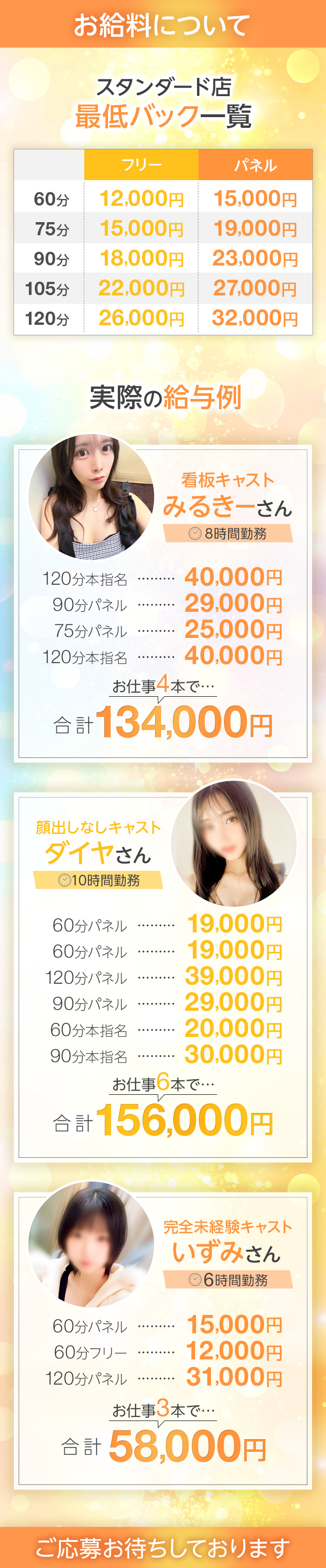 お客様が全然付かなかった場合でも一定の金額分をお店がお給料として保証してくれるシステムだよ♪「全然稼げない!」という心配がないから嬉しい待遇だね!お店によってルールに違いはあるみたいだから詳しく聞いて確認してみてね☆