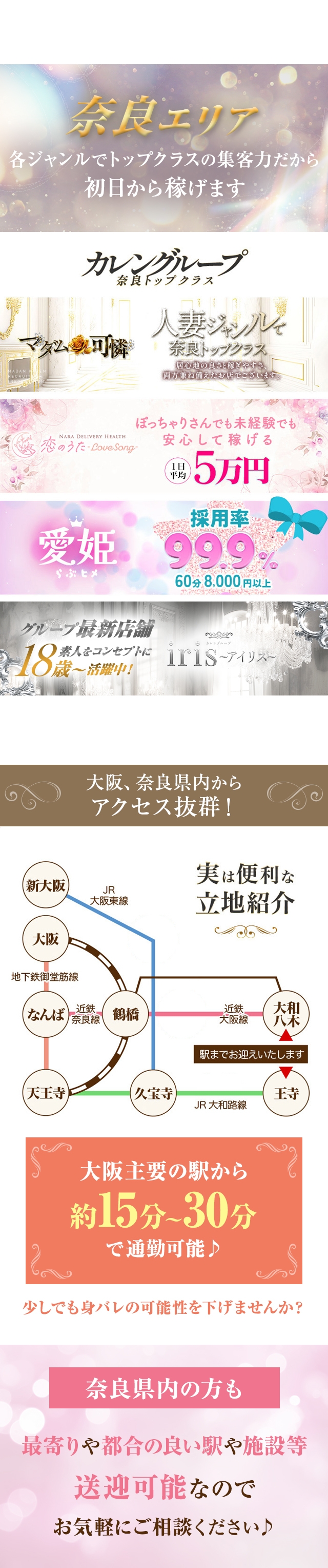 奈良県密着のグループ!通勤交通費の支給や送迎サービスも魅力!奈良県で展開する同グループ。18歳~60代が幅広く活躍し、高山さんは「どんな年齢・体型であっても合うお店が見つかると自負しています。迷われている方は一度ご相談を」と話してくれました。また通勤交通費の支給制度があるほか、終電後は送迎サービスも実施。大阪や京都など、遠方からの応募も大歓迎とのことです。
