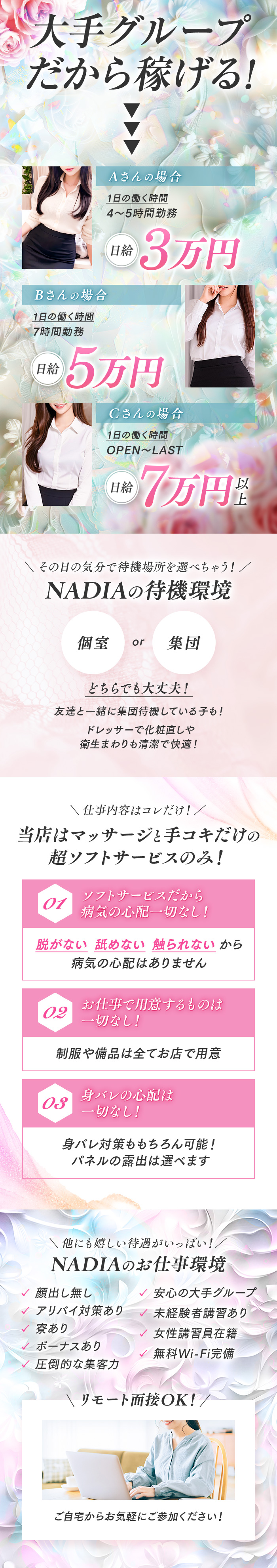 ★裸を見られたくない! ★お触りされたくない! ★キスやフェラといったヘルスプレイはしたくない! ★1日5万円稼ぎたい! そんな要望をすべて叶えられるのが…NADIA心斎橋店♪ 当店は「風俗エステ」のお店ですが、していただくのは 【全身のマッサージ】と【手コキ】だけ。 それ以外の行為はまったくしなくていいんです!! 他店は追加オプションでやらなければいけなかったりしますが、 NADIAはオプションにもないので安心・安全♪ また、系列店にはエステ店しかないので ヘルスなどのハードなお店に飛ばされる…なんて心配もありません◎ 老舗グループなので顧客数もバツグン! 受け身のエステが好きな紳士なお客様が多いので安心して働いていただけますよ♪ また、当店では身バレ対策もバッチリ完備! パネルは目出し・モザイクから選ぶことができて、モザイクの濃さも選べます! アリバイ会社の用意もございますので、 学校や昼職、家族や配偶者にも一切バレずに働くことが出来ます☆彡 ボーナス制度や給料アップ制度も充実♪ 安心・安全なソフトサービス店でガッツリ稼ぎませんか?