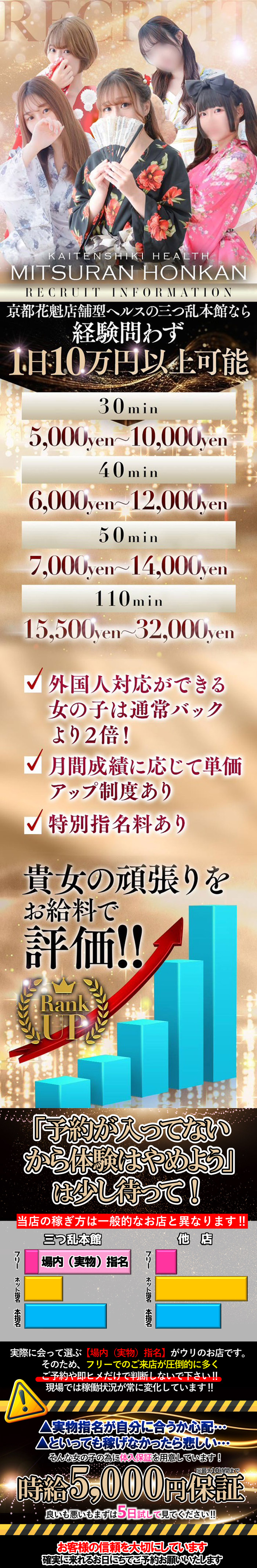 たくさんのお客様に長年のご愛顧頂き京都で16年間営業させて頂いております。 当店のモットーはお客様を大切にする事。 お客様を大切にしないお店は働くスタッフや女の子の事も大切にしません。 そんな当店が働く女の子に約束しているとても大切な事があります。 それは、1円でも多く稼いで素早くこのお仕事を卒業しよう!という事です。 このお仕事を始めるにあたっては何が何でも稼いで欲しいのです。 そして決めた目標金額を素早く稼いでとっとと卒業してください。 正直な話しをするとお給料システムなんてどのお店も大して変わりません。 お客様を獲得していけば、指名を取れれば時給がドンドン上がっていくシステムです。 当店が稼げるお店である理由はただ一つ。 たくさんのお客様にご来店頂ける!だから稼げる環境があるという事です。 オープニングキャスト募集につき5時間3万円保証と好待遇で体験入店が出来ます。 働いている女の子の70%以上は半年以内に目標金額を達成して卒業します。 それでいいのです。別に長く働く必要はありません。 たくさんの新人さんが居るので心強いと思います。 是非安心してご応募下さいませ