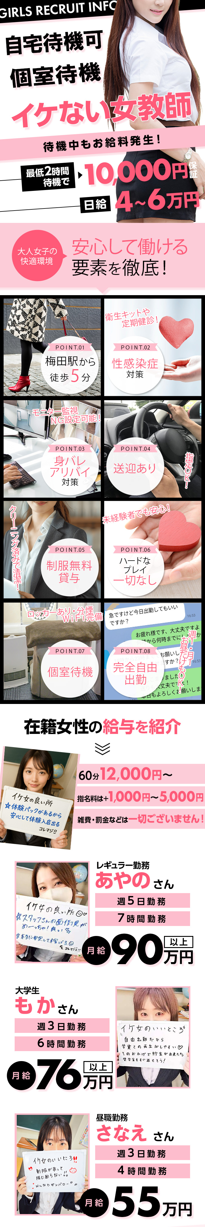 求人担当の清水です!(^^)!受け身は苦手…責めだけのプレイでヘルス以上に稼げるお店は当店だけ(^^)v~オンリーワンの風俗店だから稼げるんです~プレイ前に責め受けの得手不得手を事前にお客様に伝えてプレイしてもらうマッチングシステムを導入!これによって、ストレスフリーな稼ぎ方を実現しました♪■コンセプト店なのでお仕事の流れが決まっており、ハードなプレイ、過剰なサービスなど必要ありません!■プレイ前に『責め』『受け』の得手不得手を選んでお客様とプレイするので、苦手なプレイを強要される事は一切無し!■コンセプトは「女教師スーツコスプレプレイ」で未経験の女性でも30分で簡単にお仕事できます♪■スーツを着て女教師になりきることで仕事のオンオフができ、割り切る事でメンタル安定!例えば…受け身は少し苦手なんだけど…責めだけでお客様を満足させたい…そんな女性は当店にぴったりです♪そんなんで稼げるの…??って不安になるのもわかります。。。安心して下さい。当店のお客様の8割が受け身(責められ好き)の方なので、責めだけでも満足した稼ぎをお約束致します。勿論未経験の子や責め方はあまりわからない…そういう女性でもで30分で責め得意な女教師に変身できます!まずはお気軽にお問合せください!親切な対応をお約束いたします。