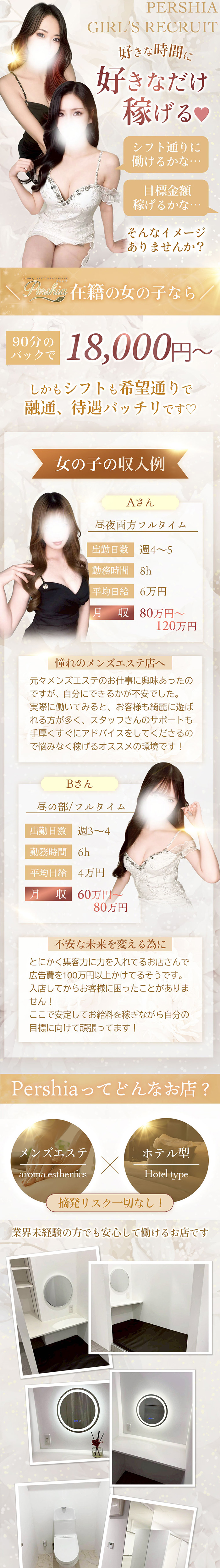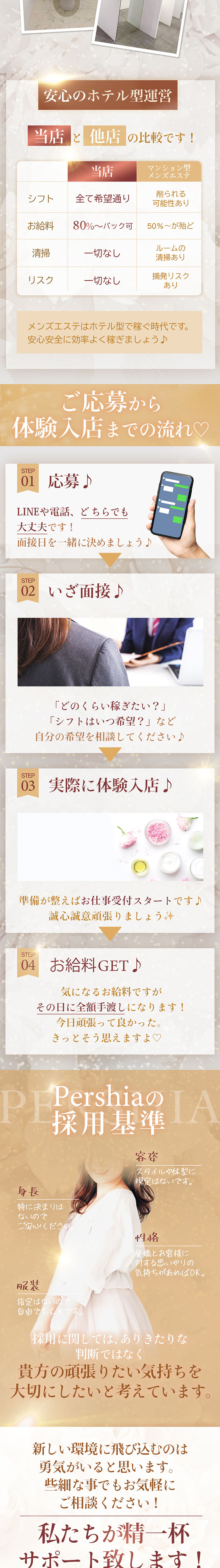 初めまして♪Pershia(ペルシア)スタッフのMです。当店は、これから挑戦したいという“気持ち”を一番大切にしており、経験の有無は一切問いません。実際に在籍しているセラピストの7割以上が未経験入店。まったくのゼロからスタートして、今では安定して稼ぎながら活躍しているスタッフがほとんどです。初めてでも無理なく進められるよう、基礎から丁寧に研修を行い、困った時はすぐに相談できる環境を整えています。勤務環境にもこだわっており、当店は安心・安全のホテル型。落ち着いた空間でお仕事に集中でき、セキュリティも万全。また、日々変化する時代に合わせて、しっかり稼げる仕組みを常にアップデート。需要に合わせた集客や働き方改革を取り入れ、未経験でも安定した収入を目指せる環境を提供しています。さらに、完全自由シフト制を導入しているため、ライフスタイルに合わせて柔軟に働けます。「週1で少しだけ」「本業としてしっかり稼ぎたい」など、すべてあなたの希望に合わせて調整可能です。一歩踏み出す勇気があれば大歓迎。あなたの新しいスタートを、当店が全力でサポートします。まずはお気軽にご相談ください。