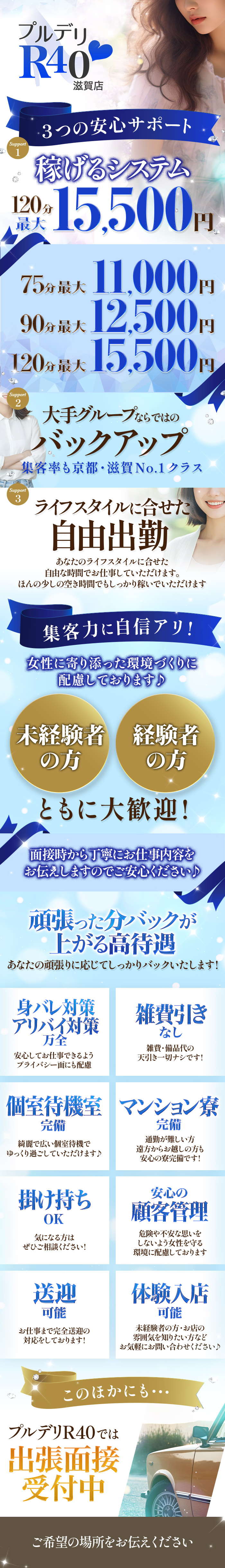 🌸よくある質問にお答えします🌸こんにちは!プルデリR40滋賀店です😊今日は女の子からよくいただくお問い合わせの中で、特に多いご質問にお答えしていきます。応募の前に読んでいただけると、きっと不安や疑問が少し和らぐと思います✨💬質問:『本当に稼げますか?』これは本当に多い質問です。ただ…正直に言うと、実際にお会いしていない段階でははっきりお約束はできません。というのも、 ルックスや雰囲気 年齢 体型 接客スタイルなどによって、働き方の提案も変わってくるからです。でも安心してください。プルプルグループは20年以上続く実績あるお店です。未経験の方・ブランクがある方・自信がない方も、たくさん稼いで卒業していきました✨🌷まずは一度お話してみませんか?当店は、対話しながら一緒に考えるスタイルです。・お仕事の不安・プライベートの悩み・働き方の相談など、どんなことでも気軽に話してください😊今まで働いたお店で、「雑に扱われた」「相談できなかった」という経験がある方こそ、安心できる環境だと思います。稼げないまま放置するようなことは絶対にしません。無理のない範囲で、あなたに合った働き方とブランディングを一緒に作っていきます🌼🍀少しでも気になっている方へ・お話だけ・見学だけ・面接だけ・体験入店だけどれでも大丈夫です😊まずはあなたの不安や疑問を聞かせてくださいね。あなたにとって、居心地の良いお店でありますように。プルデリR40滋賀