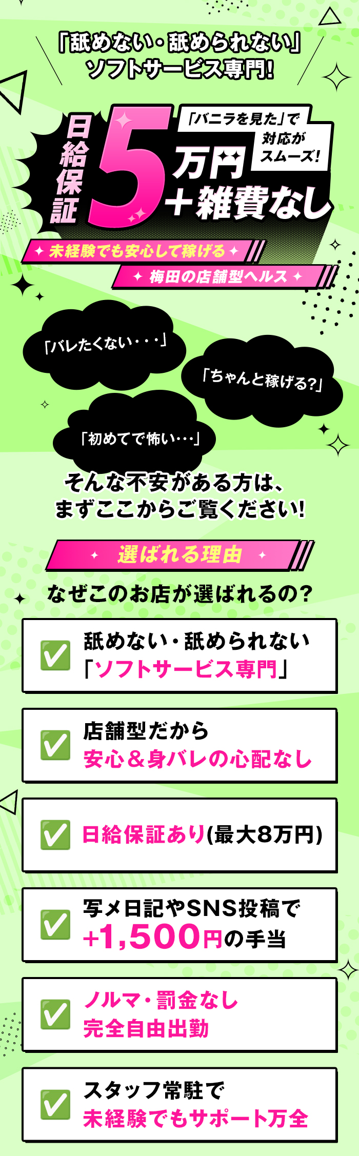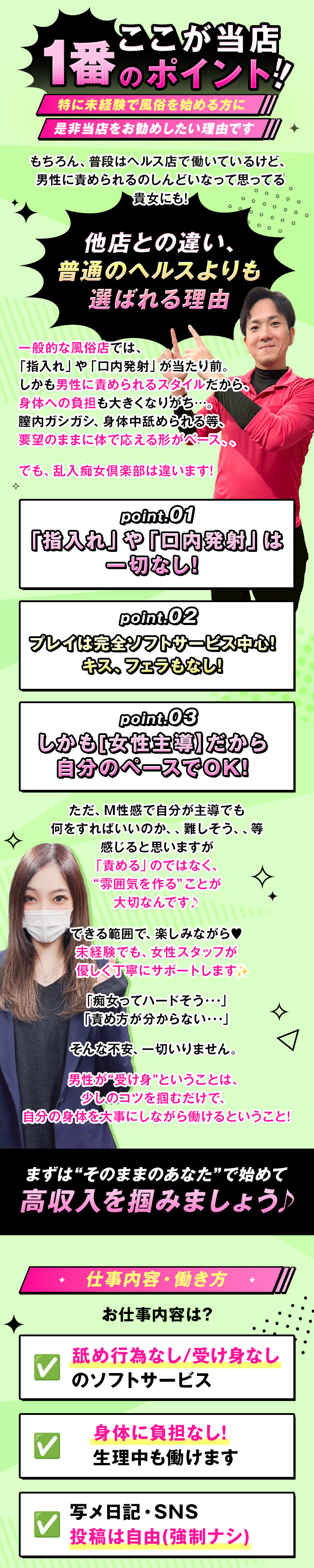 手を使うだけ・見ているだけ・または女の子が受け身にならなくてOKなソフトサービスメインのお店だよ♪初心者の女の子には始めやすいお仕事だね!コースによってサービスの違いがあるお店もあるみたいだから、お仕事内容は事前に聞いてみよう!