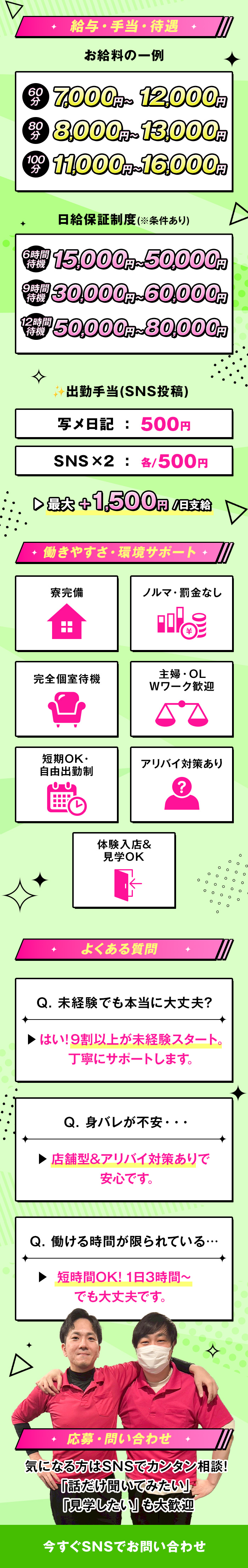 副業やWワークを歓迎しているお店だよ。時間が許す限りガンガン働いていお金を稼ぎたい女の子にはありがたいよね。シフトの入れ方にはお店ごとに決まりがあるから、詳しい条件は問い合わせてみよう♪