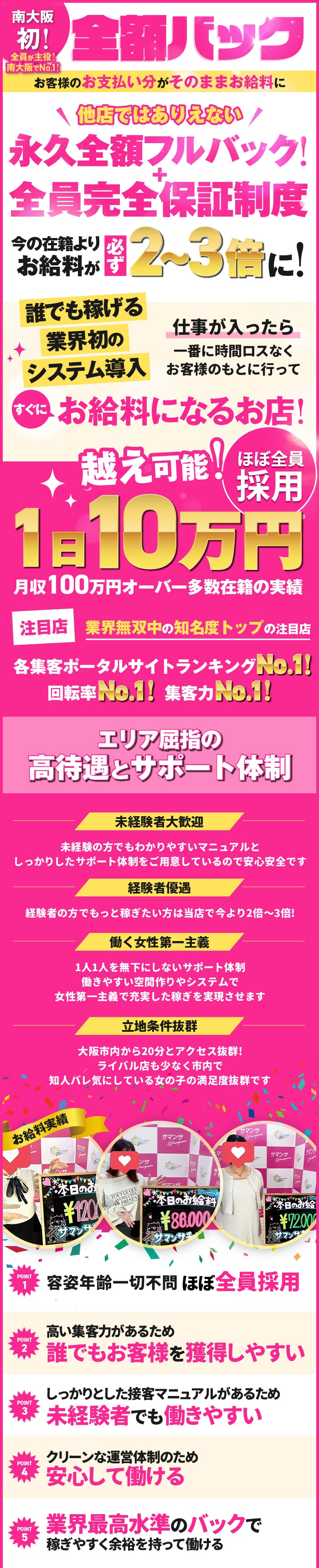 和歌山トップクラスの集客力.来客数だからお給料も満足して戴けるはず 安定した高収入をお約束します。 Google検索【和歌山】【風俗】で常に上位をキープ! 抜群の知名度の当店だからこそ、朝から夜まで、 お客様からの電話が鳴り、女の子が非常に足りない状況が続いています。 お客様の少ないお店で働くと、待機ばかりであまり稼げないということがあります。 せっかく風俗のアルバイトをするのであれば、稼げなければ意味がありませんよね? 当店では、待機ばかりで稼げないということはあり得ません。 高い知名度とたくさんの会員様に支えられている人気店で働いてみませんか? 初めて働くなら、知名度の高いお店が安心です。 前のお店の集客や稼ぎに満足していなかった女の子も、当店で再スタートを切りましょう。 年中無休の24時間営業致しておりますので貴女のお好きな時間帯で 自由に出勤していただけます!週1日・1時間のみの出勤も可能! 出勤ノルマ・罰金制度なども一切御座いません。 ■サマンサ■ 応募受付時間24時間 担当者直通ダイヤル:090-6324-6946 メアド:samanthagroup8657@gmail.com LINE:w-Samantha