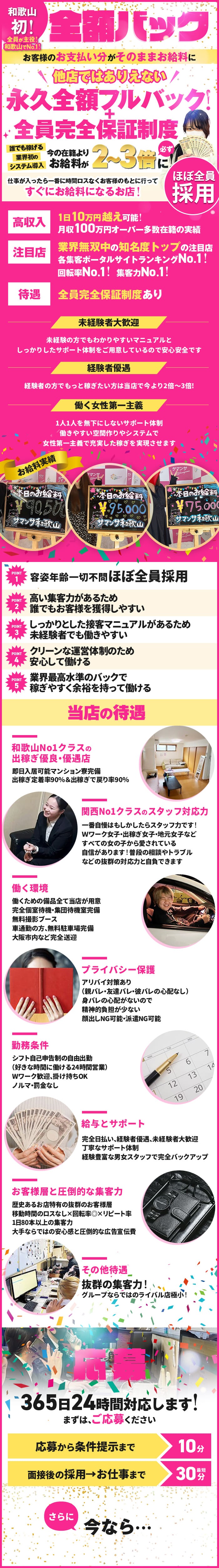 和歌山トップクラスの集客力.来客数だからお給料も満足して戴けるはず 安定した高収入をお約束します。 Google検索【和歌山】【風俗】で常に上位をキープ! 抜群の知名度の当店だからこそ、朝から夜まで、 お客様からの電話が鳴り、女の子が非常に足りない状況が続いています。