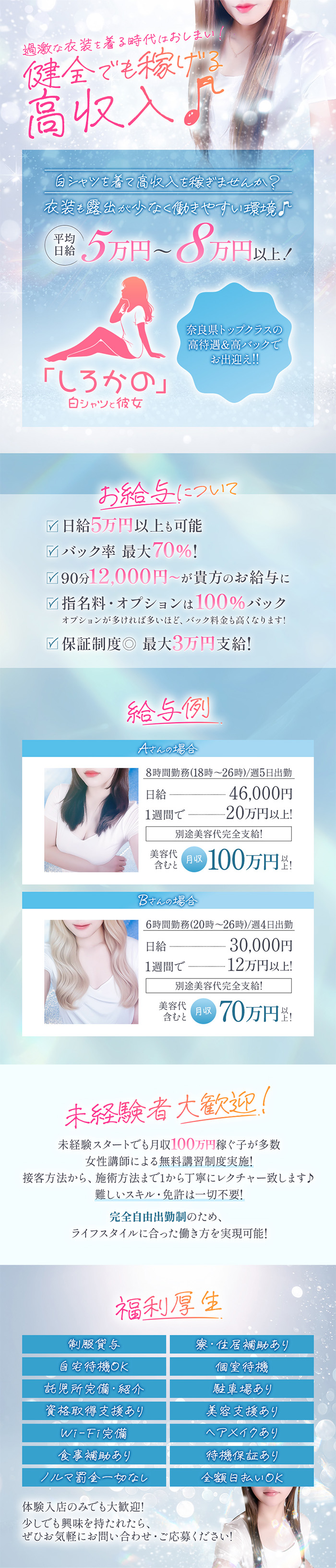 奈良エリアだから稼げる高収入!バック率60%以上でお出迎え♪平均日給5万円以上が平均して稼げる環境です!!当店の求人をご覧頂きありがとうございます!!当店は即日体験入店大歓迎です!そもそも即日体験入店ってなに?からの方も多いかと思いますのでご説明いたします!体入(体験入店)とは、試しにお店で実際にサービスをしてみて良さそうだなと思えば正式に入店できる仕組みになります!面接で話を聞くだけでは想像しづらいものを実際に体験できるので、しっかり疑問を解消してから働けます!!未経験者でも大丈夫!!講習制度も充実しているので未経験からでも安心して勤務頂けます!!当店はフリーのお客様も非常に多い為、働きやすく、稼ぎやすい環境です!勤務時間にもよりますが、歩合制(60%~70%)で指名料・オプション100%バックですので日給5万円以上も可能です! 最高70%でオプションが多ければ多いほどバック料金も高くなります!!1度体験入店で自分に合っているか試してみてください!!質問だけでも大丈夫!いつでもお問合せ・ご応募お待ちしております!