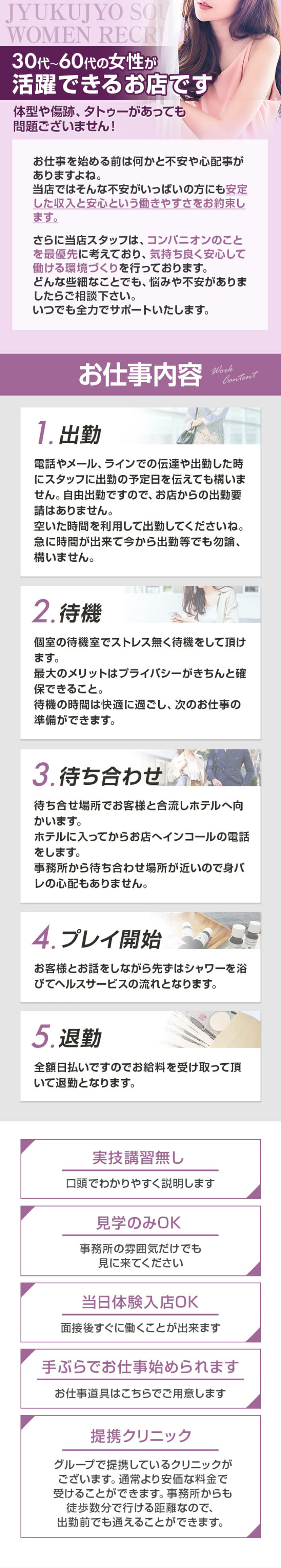 手を使うだけ・見ているだけ・または女の子が受け身にならなくてOKなソフトサービスメインのお店だよ♪初心者の女の子には始めやすいお仕事だね!コースによってサービスの違いがあるお店もあるみたいだから、お仕事内容は事前に聞いてみよう!