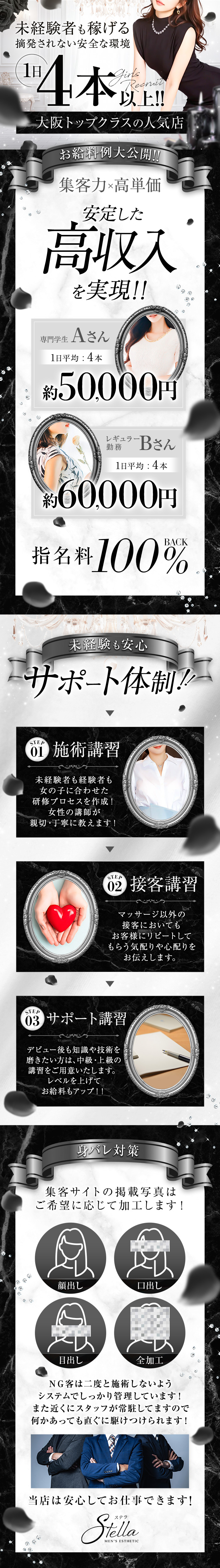大手グループが経営しているお店だよ。待遇や条件も手厚くて安心だし、集客力もあって女の子が稼ぎやすい!待遇や条件はグループの中でも店舗ごとに変わってくるから、気になるポイントは問い合わせて聞いてみよう♪