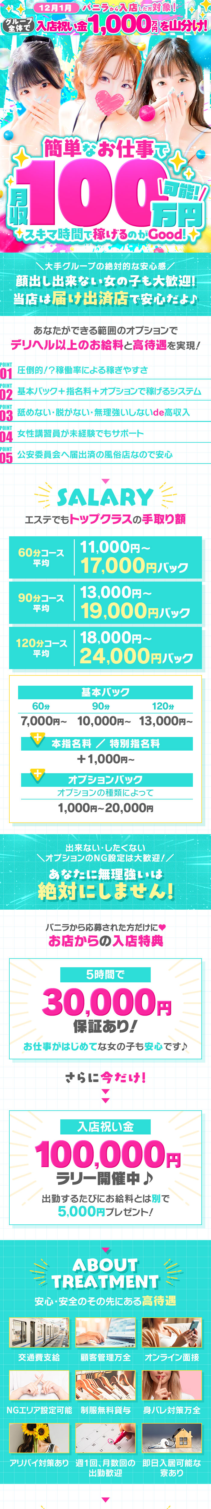 📣未経験も安心の保証あり♪ ♦短時間保証5時間 20,000円〜30,000円 ♦60分バック11,000円〜17,000円も可能!💰 オプション追加率100%! + さらに!今だけ特典! ■もらって嬉しい入店祝い金10万円 ■好きなギフト券配布中!