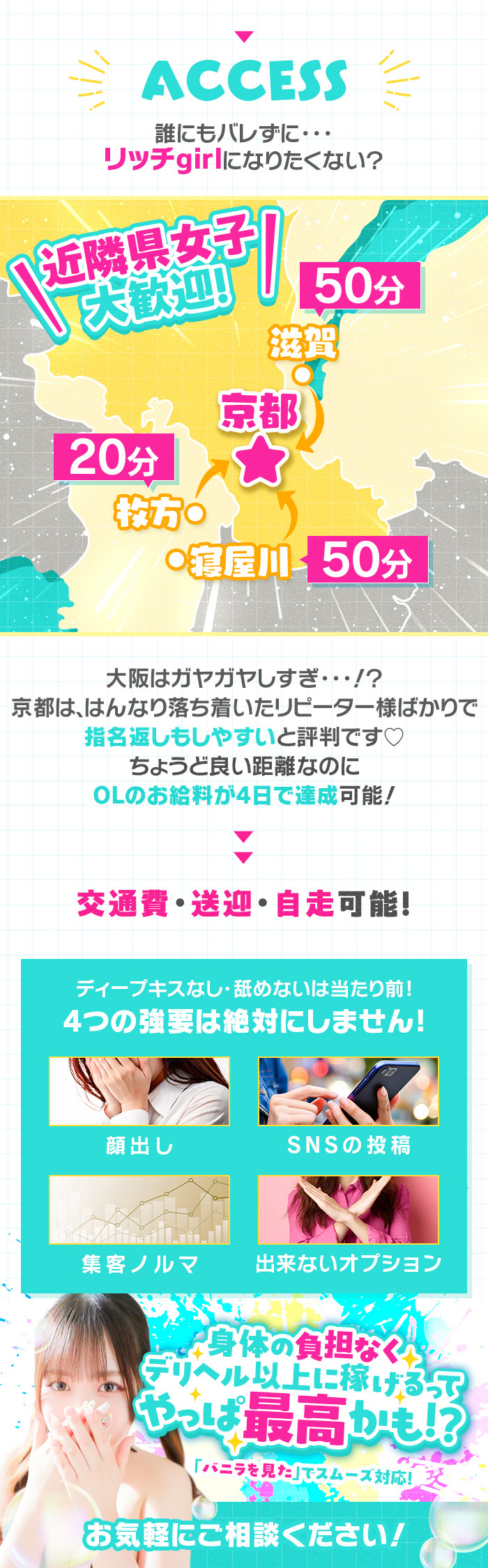 ◆ポイントその1 圧倒的な顧客数 入れ替わりの激しいデリヘル業界ですが… 当店は京都トップクラスの集客力のある実力店! 効率良く稼げるお店です☆ ◆ポイントその2 学生から主婦まで全員採用 どんなタイプの女の子も大歓迎! 顔出ししなくてもOK! 身バレの心配も必要ありません♪ ◆ポイントその3 多すぎる集客数 ・WEBのポータルサイト ・大手情報雑誌 ・街の案内所など 広告費毎月300万円以上! お客様が利用しやすい価格帯の為 毎日多数のお客様にご利用頂いております ロングコースが多く少ない本数で身体に負担なく稼げます! \今だけの入店キャンペーン/ 未経験大歓迎 容姿年齢不問 全員採用で自信のない子も安心!