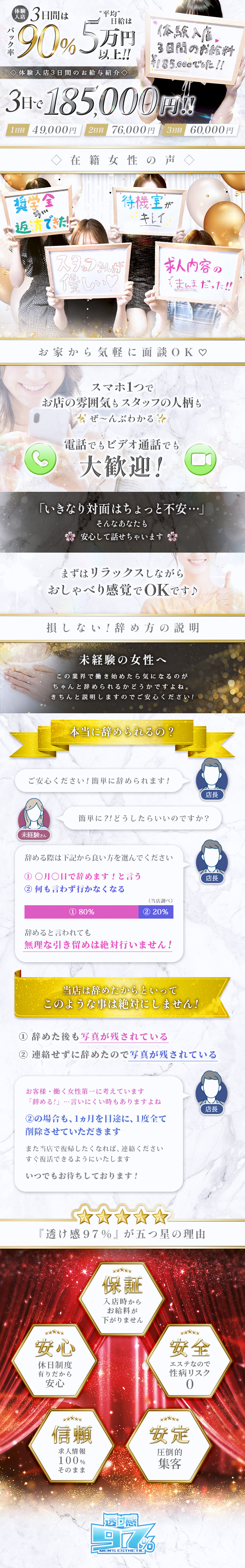 はじめまして!透け感97% 店長の吉田です🌈「ちょっと気になるけど、自分にできるか不安…」「実際のお店の雰囲気を見てから決めたい…」そんな風に思っている方へ。当店では、まず安心してスタートできるように最大3日間の体験入店をご用意しています✨実際に働いてみることで、✔ お店の雰囲気✔ お仕事内容✔ 自分に合っているかどうかをしっかり確かめていただけます。3日間体験していただいたあとに「続けたい」と思うかどうかを決めていただければ大丈夫!もちろん、強制も勧誘も一切ありません🙅♀️わからないことや不安な点は、どんな小さなことでもお気軽にご相談ください😊私がしっかりサポートしますので、安心してお越しくださいね。あなたが一歩を踏み出すその瞬間を、心から応援しています🌸