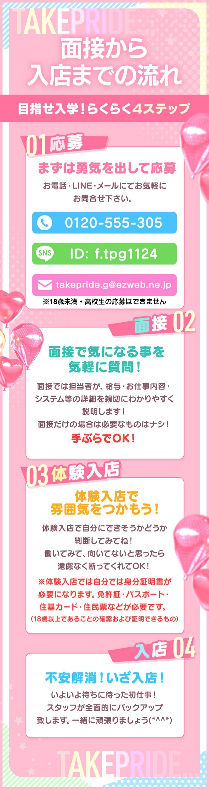 ていくぷらいど.学園のお客様層年齢層は30代~50代で、とても優しく紳士的な方が多いです。初めて間もない時は、こうするとお客さんは喜んでくれるよってためになることを教えてくださるお客様もおられました。本当に優しく紳士なお客様ばかりでびっくりしました。初日の緊張が嘘のように安心してお仕事できています。お客様もお店のことをとても信頼して下っているのが伝わってきてすごく良い関係だなと日々感じています。お店側からのお客様への注意がきちんとしているので嫌な思いをしたことはあまりありません。偏見で学園系のお店って客層が悪いイメージでしたが、常連様も多いですし優しくて紳士的なお客様ばかりで安心してお仕事できます。どのお客様も女の子の嫌がることはせずに優しいお客様が多いです。初日は初心者で緊張してましたがどのお客様もいろいろ教えてくださったりして嬉しかったです。また積極的にお話をするとお客様も笑顔で聞いてくれたりするので毎出勤楽しいです。【求人専用ダイヤル】0120-555-305【メールアドレス】takepride.g@ezweb.ne.jp【LINE ID】f.tpg1124※18歳未満・高校生の応募はできません。【面接担当者】はらぺこみどりむし
