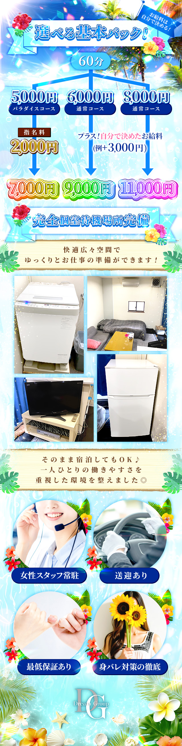 通常コース60分6,000円~ ご自身でバック率(給料設定)を決める事が可能です。 自信が付くまでは通常コース。自信が付いたから+1,000円などなど、ご自身で設定を変更できるのが特徴です。