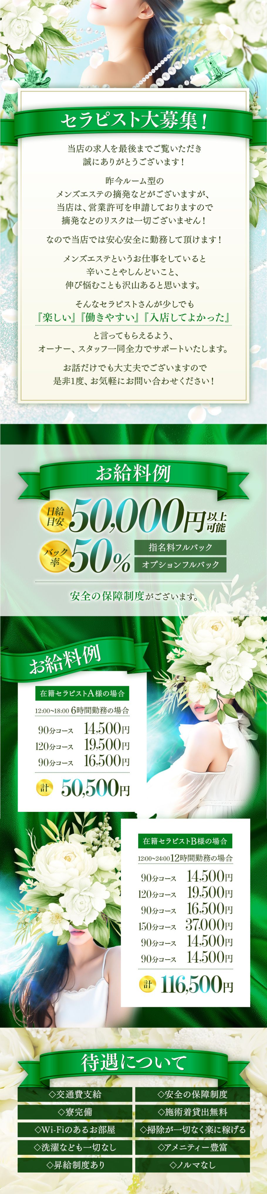 当店の求人ページをご覧いただきありがとうございます!!メンズエステのお仕事に少し不安を感じている方も、ご安心ください🌸当店は、きちんと営業許可を申請・取得している【安心・安全なメンズエステ】です💆♀️✨ルールを守った運営を徹底しており、セラピストさんがリスクなく働ける環境を整えています。さらに在籍スタッフ同士の雰囲気もとっても良く、困ったことがあればすぐに相談OK🙆♀️未経験の方でも丁寧な研修で安心してデビューできます🎀「はじめてで緊張する」「環境が合うか不安…」そんな方でも、きっと長く続けられます。もちろん高収入も目指せます💰✨安定した集客力で、毎日しっかりお客様に入れる人気店だから、【安心×安定×高収入】を同時に叶えられるのが当店の強みです🌈和歌山から通勤の方も多数在籍中!あなたも仲間入りしませんか?😊あなたからのご応募を心よりお待ちしております!!